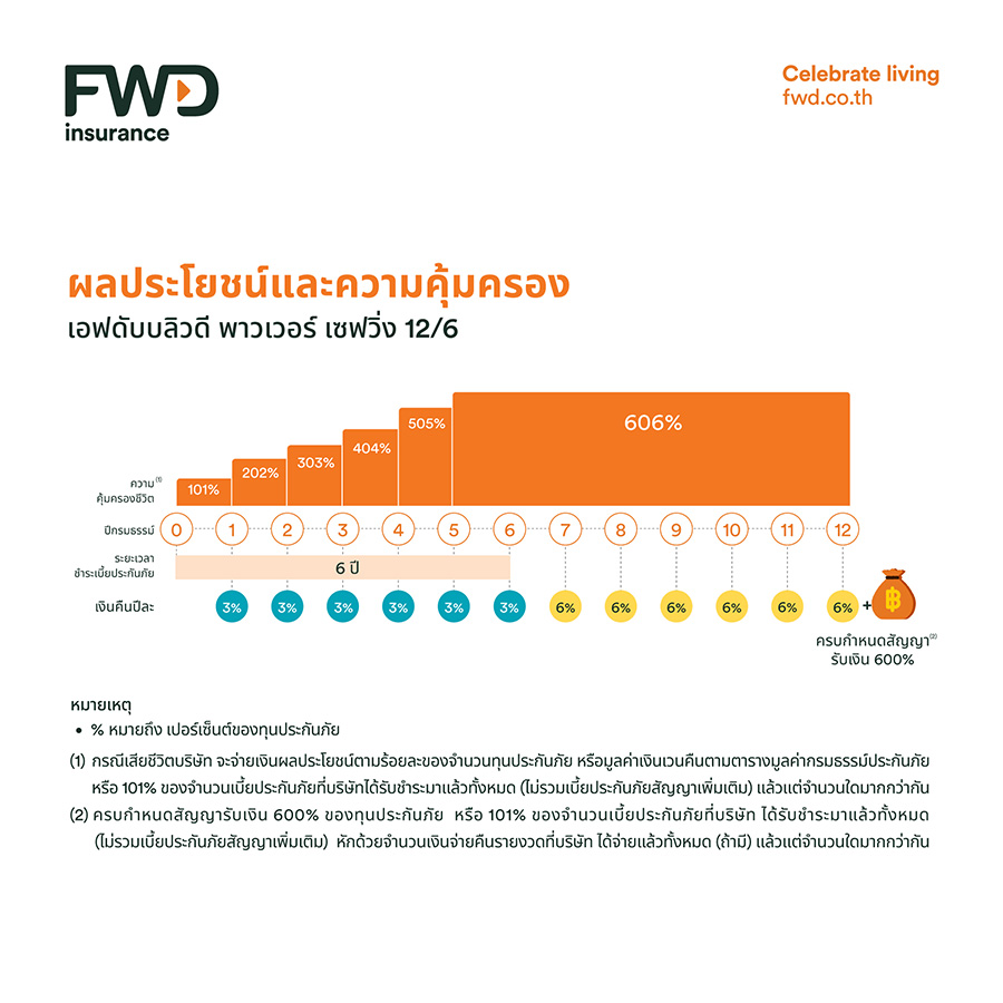 เป็นประกันชีวิตสะสมทรัพย์ ชำระเบี้ยประกันภัยเพียง 6 ปี ได้รับความคุ้มครองชีวิตยาวถึง 12 ปี คุ้มค่าด้วยผลประโยชน์รวมตลอดสัญญาสูงสุดถึง 654% ของทุนประกันภัย พร้อมรับเงินคืนปีละ 3% ของทุนประกันภัย ตั้งแต่สิ้นปีกรมธรรม์ปีที่ 1 ถึงปีที่ 6 และรับเงินคืนเพิ่มเป็นปีละ 6% ของทุนประกันภัย ตั้งแต่สิ้นปีกรมธรรม์ปีที่ 7 ถึงปีที่ 12 เมื่อครบกำหนดสัญญารับเงินก้อน 600% ของทุนประกันภัย*
